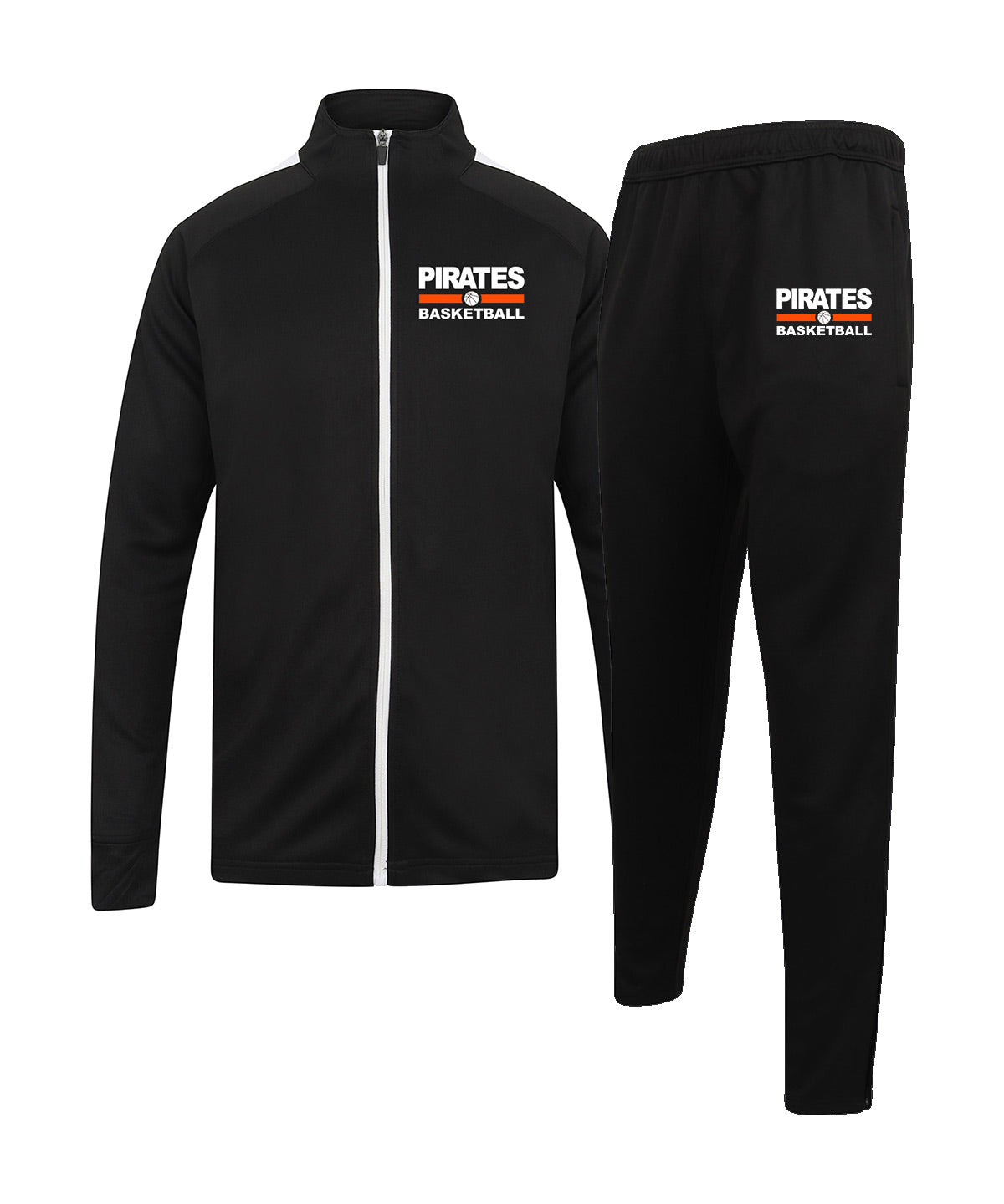 Avsmalnande byxor med dragkedjor i benslut. Fickor på både jaacka och byxa med dragkedja.
